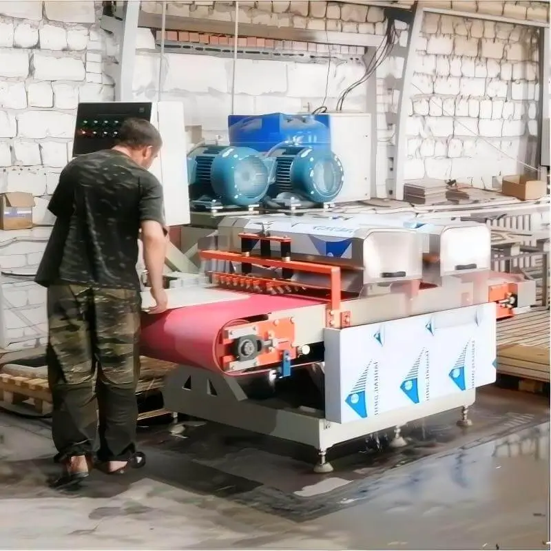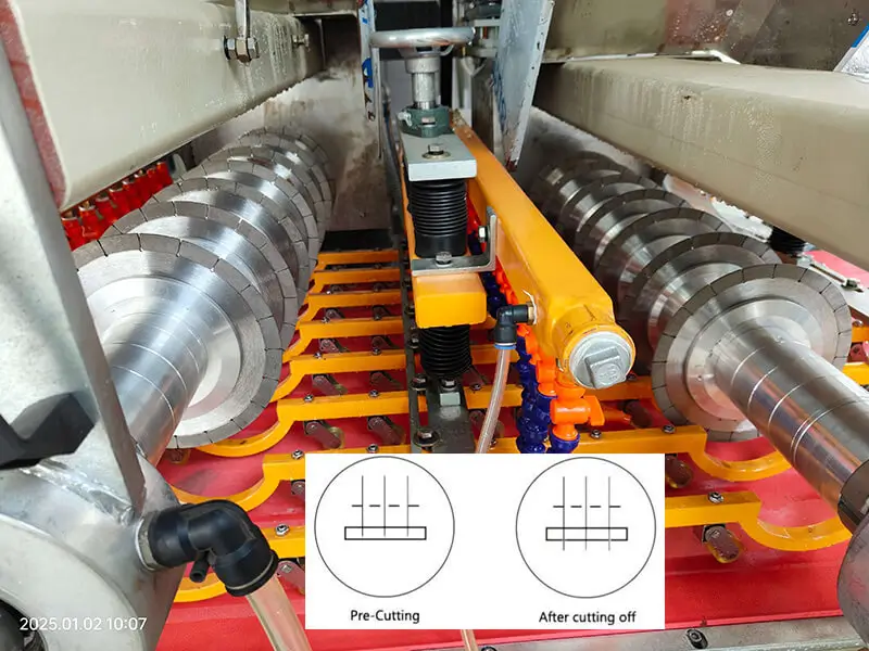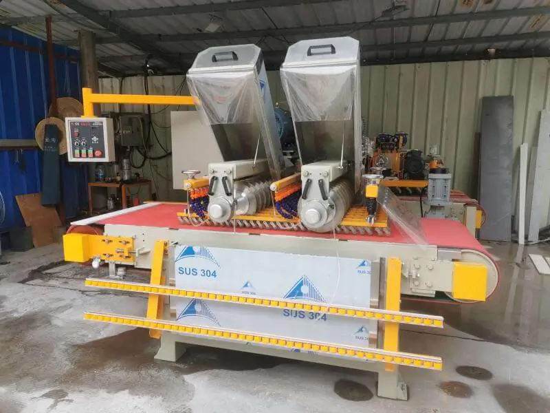 The machine the adopts double spindle, one pre-cut the half edge, the other cut off the whole tile edge.