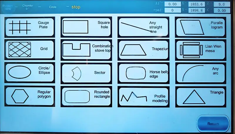 You can cut side to side and front to back, create 45-degree bevels on all edges, make angled cuts in any direction, and shape diamond patterns, rounded edges, circles, ovals, or custom profiles.