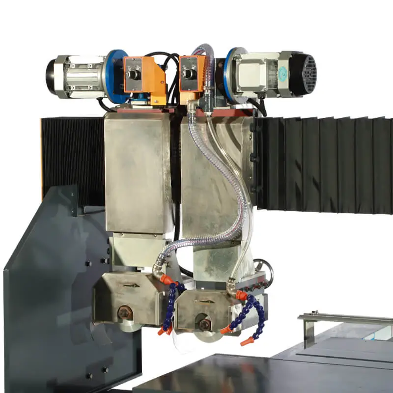 BT1800 double heads small Bridge Saw Machine,2 in 1 Multi-functional, both straight edge resize cutting and tilting 45 mitering or chamfer. It’s an compact and heavy duty for small tiles cutting factories.It adopts high speed motor and PLC system, easy operation and accurate size.